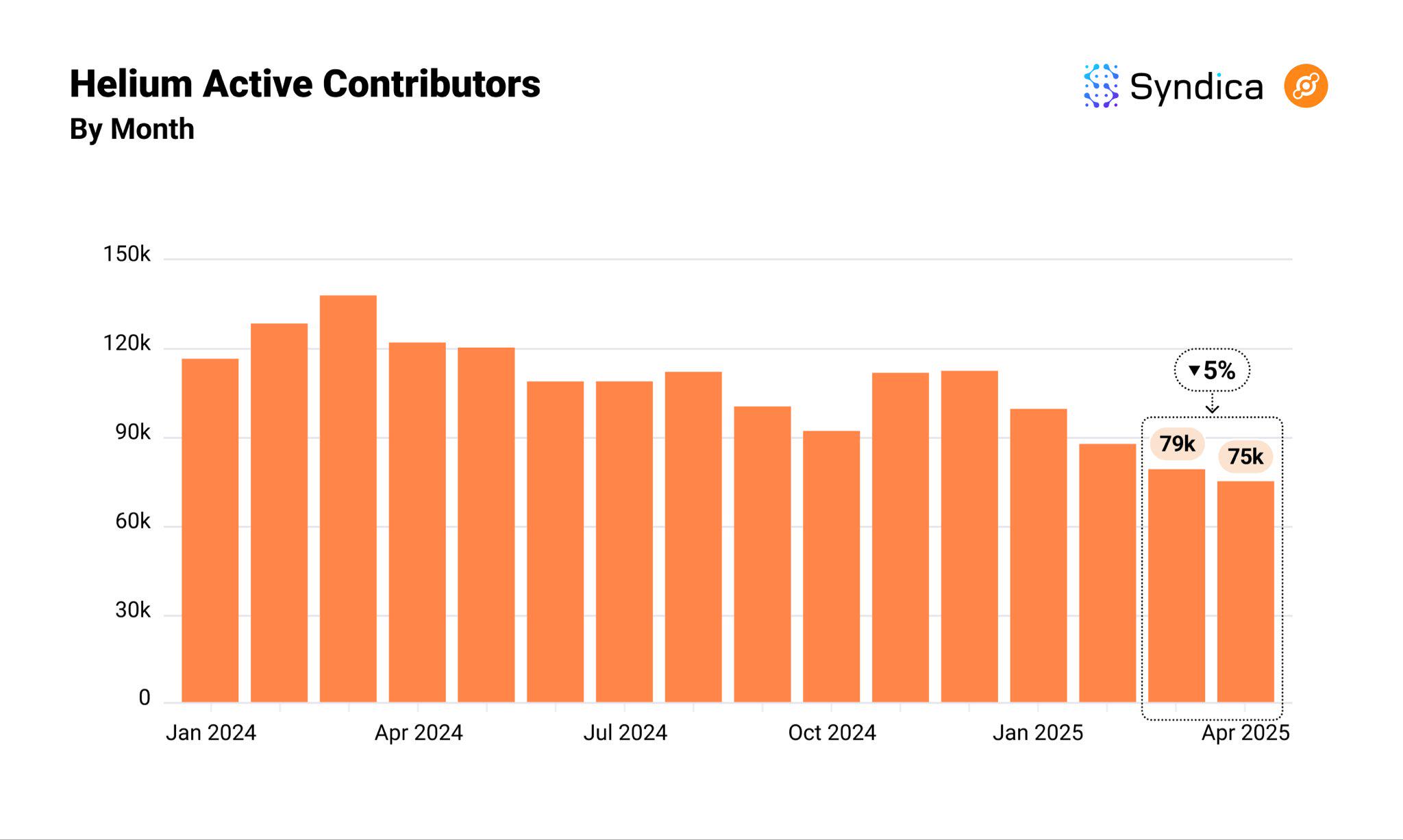 注目すべきは、2025年以降、Heliumのアクティブ貢献者数は若干の減少傾向を示しており、Heliumのアクティブ貢献者数は約7.5万人で安定していることです。