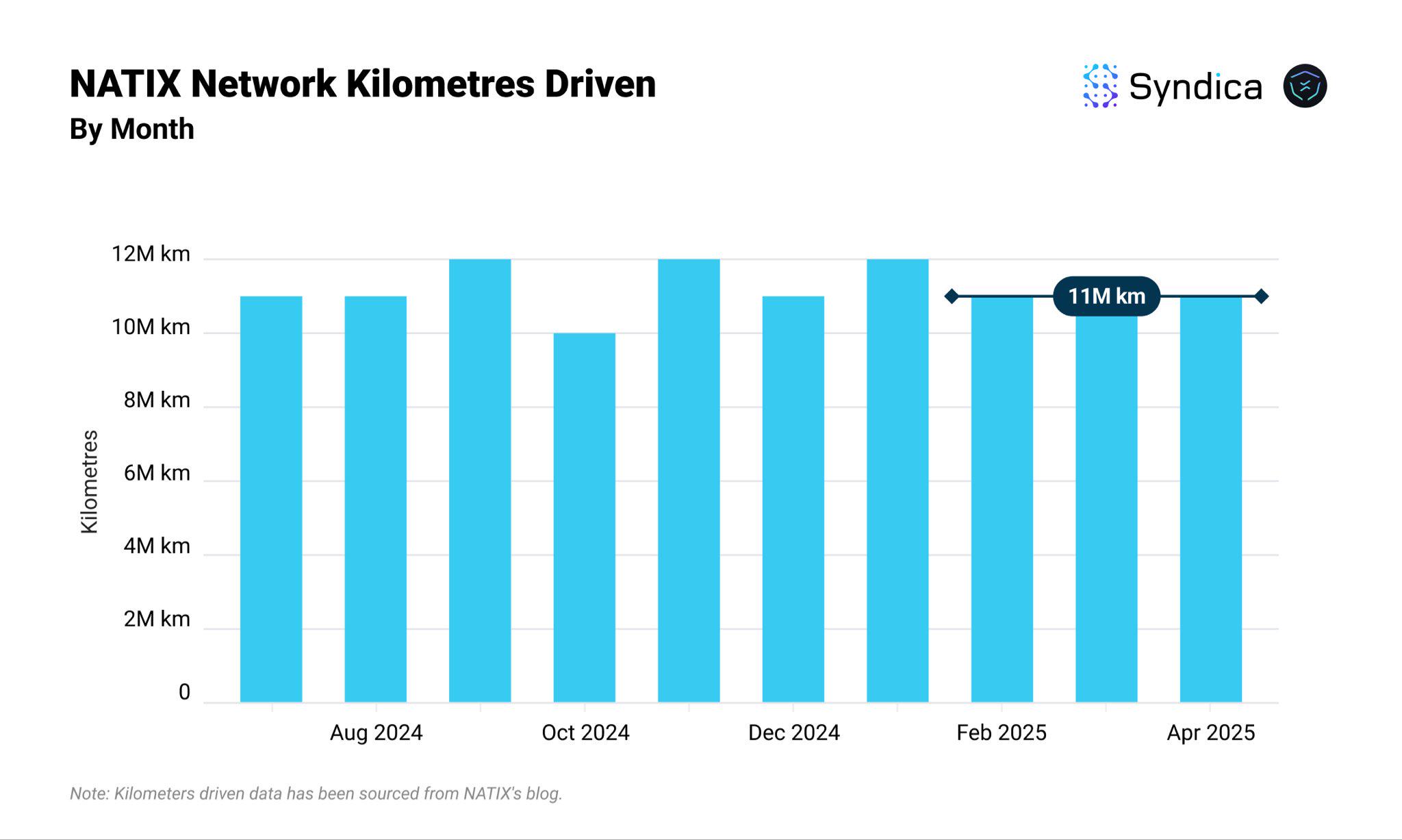 NATIX Networkは、スマートフォンや専用デバイスを通じてストリートビューや地理データを収集し、地図作成、自動運転、物理AIに高精度の位置情報と映像サポートを提供することを目的としています。参加者はデータの貢献に対してトークンの報酬を得ることができます。このエコシステムは4月に安定を保ち、ユーザー駆動のマイルストーンは3ヶ月連続で1100万キロメートルを維持しました。