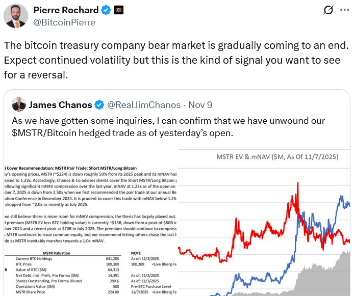 ソース: CryptoNewsNet原題:ビットコインの財務資産の弱気市場は、ショートセラーがMSTRから手を引くことで終わることが示唆されているオリジナルリンク: ビットコイン財務企業の株は、投資会社が戦略に対してショートポジションを閉じたと発表した後、価格動向が抑制された期間の終わりに近づいている可能性があります。キニコス・アソシエイツの創設者ジェームズ・チャノス氏は、日曜日に彼の投資会社が金曜日の取引開始時にマイケル・セイラーの戦略(MSTR)に対するショートポジションを解消し、ビットコイン(BTC)に対するロングポジションを解消したと述べました。"ビットコイン財務会社の弱気市場は徐々に終わりを迎えつつあります," ビットコインボンド会社のCEO、ピエール・ロシャールが応じました。チャノスは、ストラテジーの株は2025年の高値から約50%下落しており、同社の市場ネットアセットバリュー(mNAV)は1.23倍に圧縮されたと述べました。「最近2025年7月に約2.0倍から下落し、mNAVが1.25倍未満のこの取引をカバーすることは慎重である」とチャノスはメモに書いた。彼は、MSTRの暗示的なプレミアム、つまりその企業価値から641,205 BTCの価値を引いたものが、7月の約$70 億から$15 億に減少したことを付け加え、同社の評価が現在はより適切かもしれないと示唆しました。MSTRは、特により多くの普通株を発行する場合、さらなるmNAV圧縮を経験する可能性があるが、「その仮説はほぼ実現した」とChanosは述べた。"これは反転のために見たいタイプのシグナルです,"とロシャールは言った。ビットコインをバランスシートに保有する200の上場企業の多くの株が、最近数ヶ月で急落しており、そのため一部のアナリストはビットコインの財務戦略の持続可能性に疑問を抱いています。## 戦略は総価値の観点から最も大きな打撃を受けています戦略は、総価値の観点から最も大きな打撃を受けており、市場の時価総額は7月の1221億ドルから金曜日の695億ドルに43%以上減少しました。2025年の始まりに東京証券取引所で最もパフォーマンスの良い株の一つであるメタプラネットは、6月21日以来、その時価総額が56%削減されるという同様の状況に直面しています。他のビットコイン購入企業は、未払いの負債を支払うために、いくつかのBTC保有を手放さなければならなかった。## 暗号市場の圧力は近く緩和される可能性がある市場を抑制している最大の要因の一つは米国政府のシャットダウンですが、複数の米国メディアは日曜日に、上院がシャットダウンを終わらせるための予算法案のパッケージを通過させる合意に達したと報じました。ビットコインは、報告から50分以内に2%上昇し、$106,430になりました。これは、政府の再開が仮想通貨市場へのセンチメントを高める可能性があることを示唆しています。
