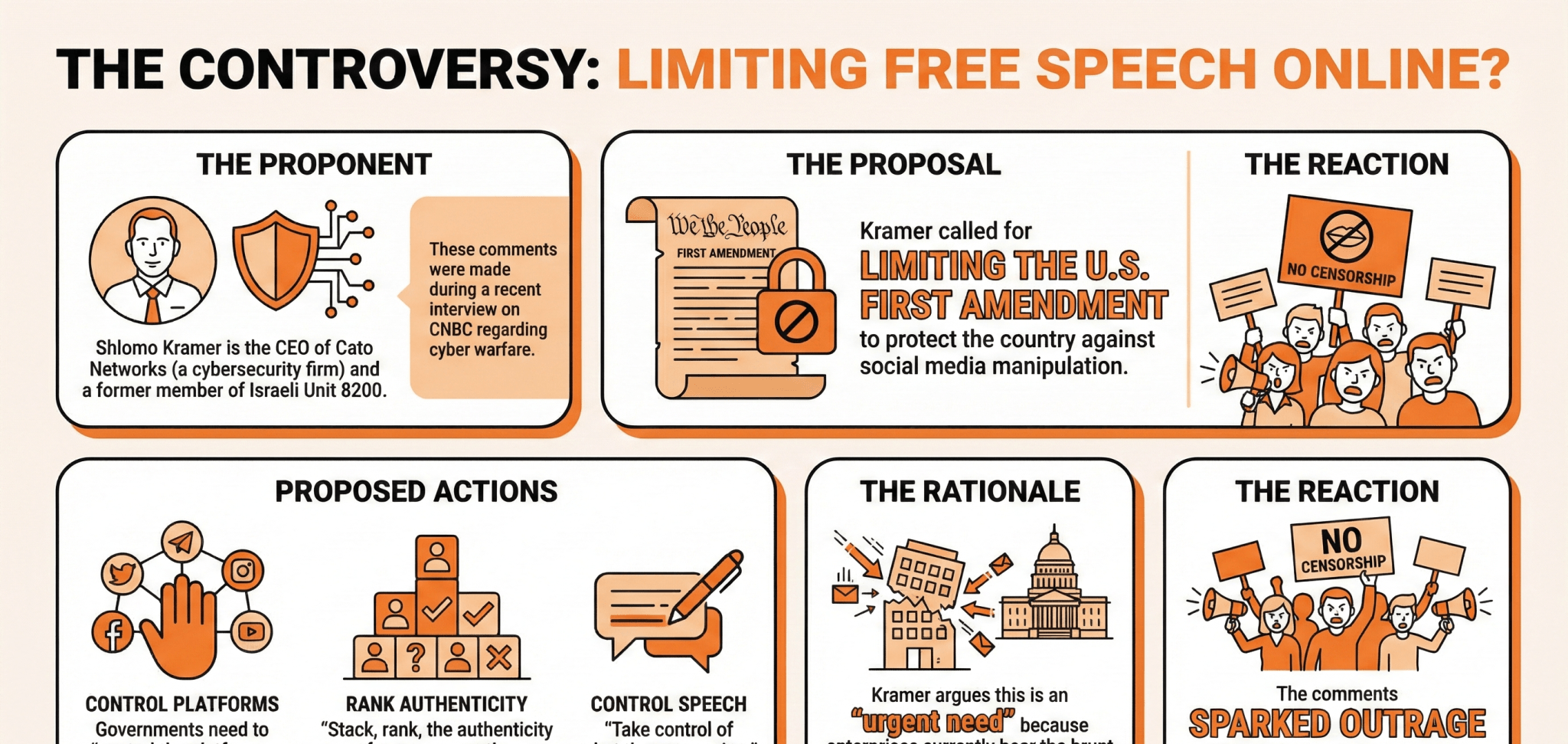 サイバーセキュリティ企業のCato NetworksのCEO、Shlomo Kramerは、アメリカ合衆国憲法の第一修正の範囲を制限する必要があると呼びかけ、国の未来を守るためだと述べた。