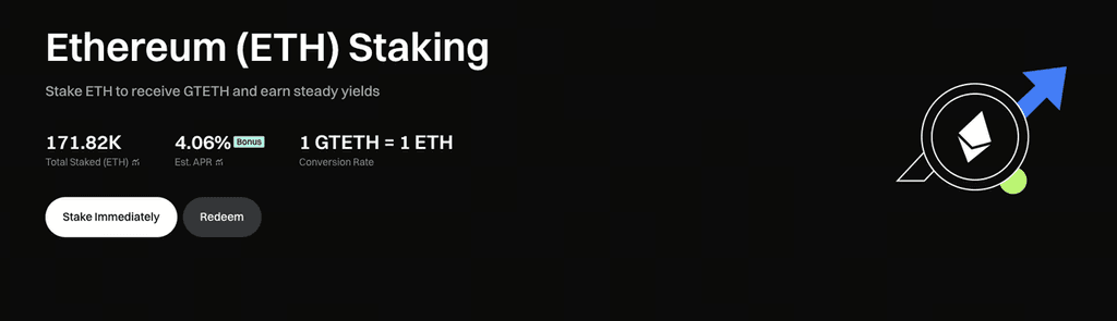 暗号市場の変動の中で、ETHはコア資産として、その価格はしばしば激しく変動します。投資家はしばしば、ETH資産の価値増加を享受しながら、安定した収益を得たいと考えています。GTETHはこの問題を解決するために設計されており、年利4.06%のリターンを提供し、投資家に追加の収益源をもたらします。