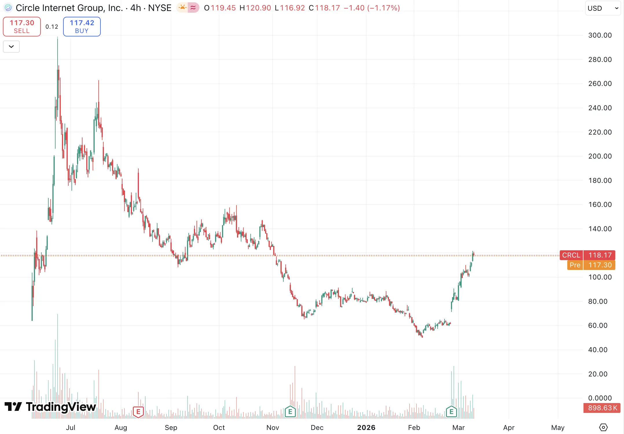 Last June, Circle went public at $31 per share. Two weeks later, the stock hit $299. Then, it dropped back to $50, a decline of over 80%. In February this year, after earnings were released, the stock doubled in two weeks, closing today at $111.