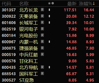 Data shows that among the 12 constituent stocks in the sector, 11 stocks gained more than 5%; only ST Emergency (300527.SZ) had a slightly lower increase at 4.95%. Notably, Great Wall Military Industry (601606.SH), Optical Electronics (600184.SH), and Galaxy Electronics (002519.SZ) hit the daily limit, while Northern Long Dragon surged 16.44%, and Tianqin Equipment also rose 12.12%.