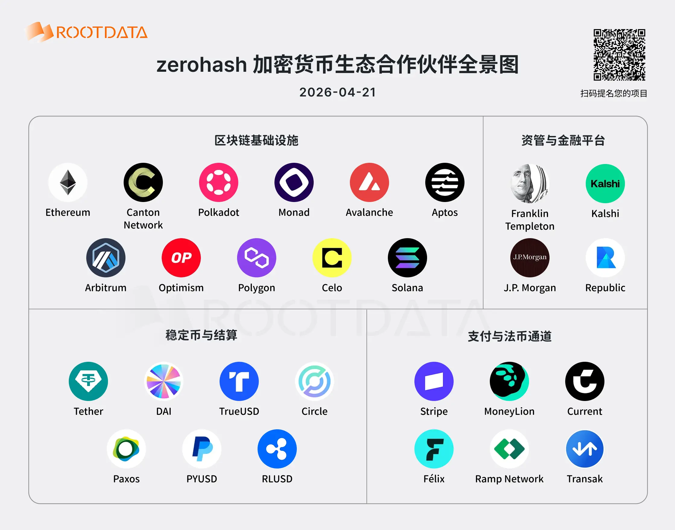ChainCatcher News, the Web3 asset data platform RootData has organized the Web3 business partners of Zero Hash. Its partners now cover key segments such as asset management institutions, payment channels, public blockchain infrastructure, and stablecoin systems, and are building a cooperation network centered on compliance clearing and asset access.