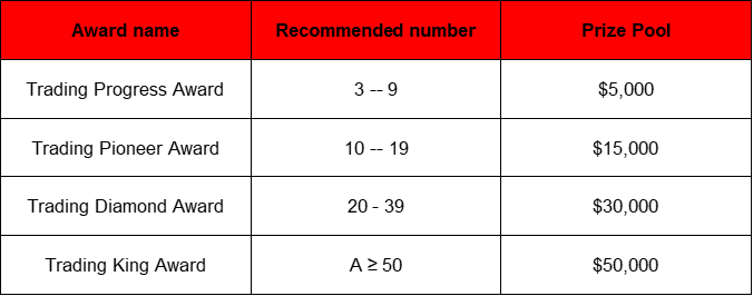 Note for the following: The Trading Progress Award, Trading Pioneer Award, Trading Diamond Award and the Trading King Award the corresponding minimum transaction volumes are:>$1,000、>$10,000、>$20,000、>$50,000.
