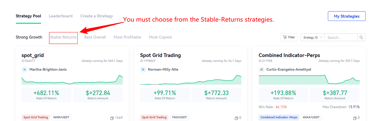 A partir de agora, os usuários que escolherem e copiarem uma estratégia da lista de estratégias "Retornos estáveis", ou copiarem as cinco estratégias de alta qualidade acima recomendadas pela plataforma Strategy Bot, receberão uma recompensa de 10 USDT, independentemente de lucros ou perdas!