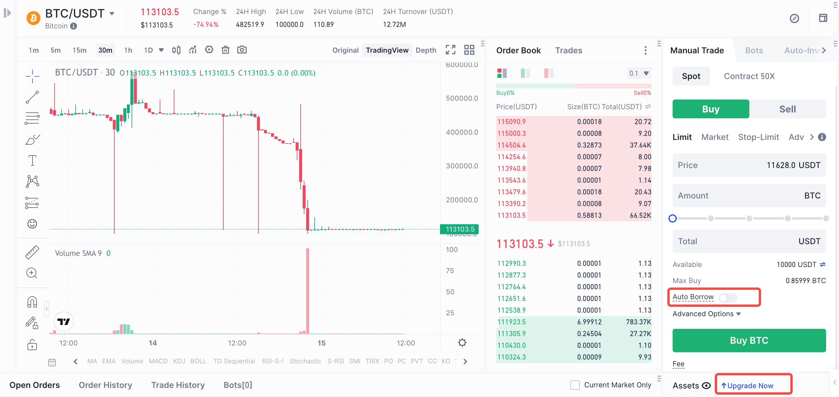 Opção A) Página do mercado spot: alterne o botão “Empréstimo automático” ou clique no banner de atualização na parte superior.