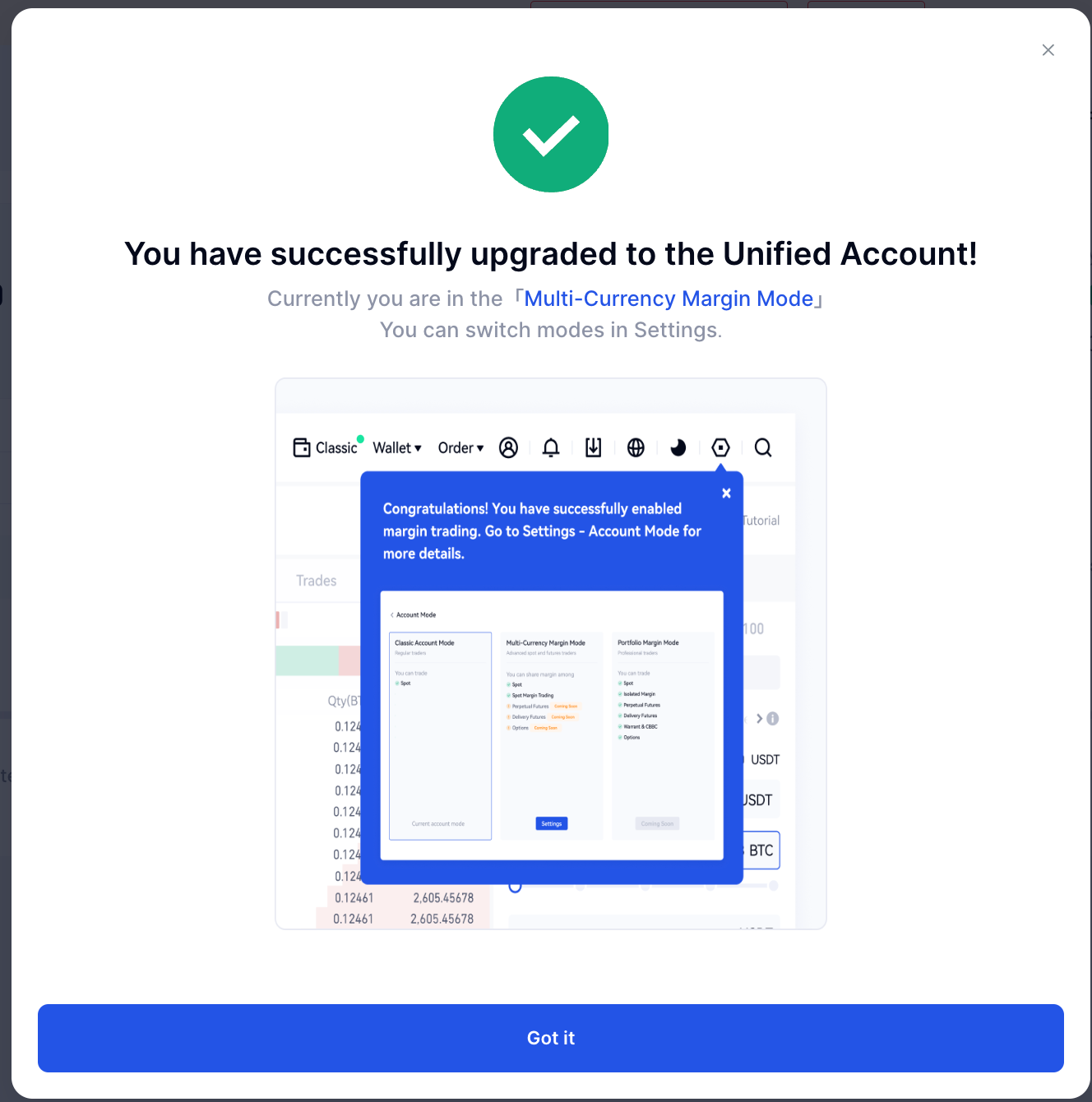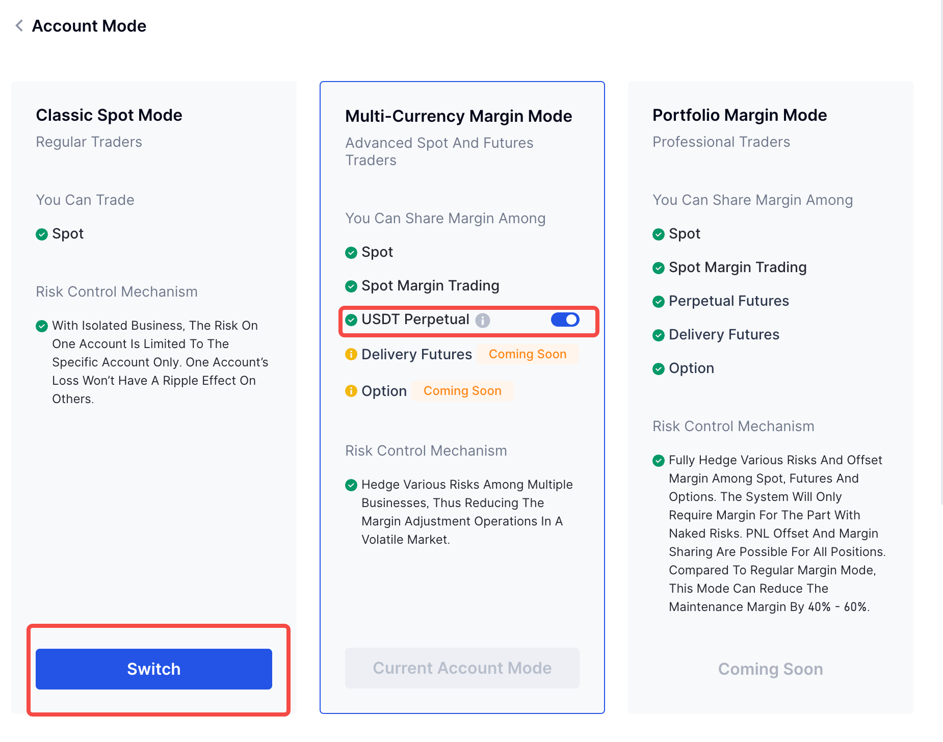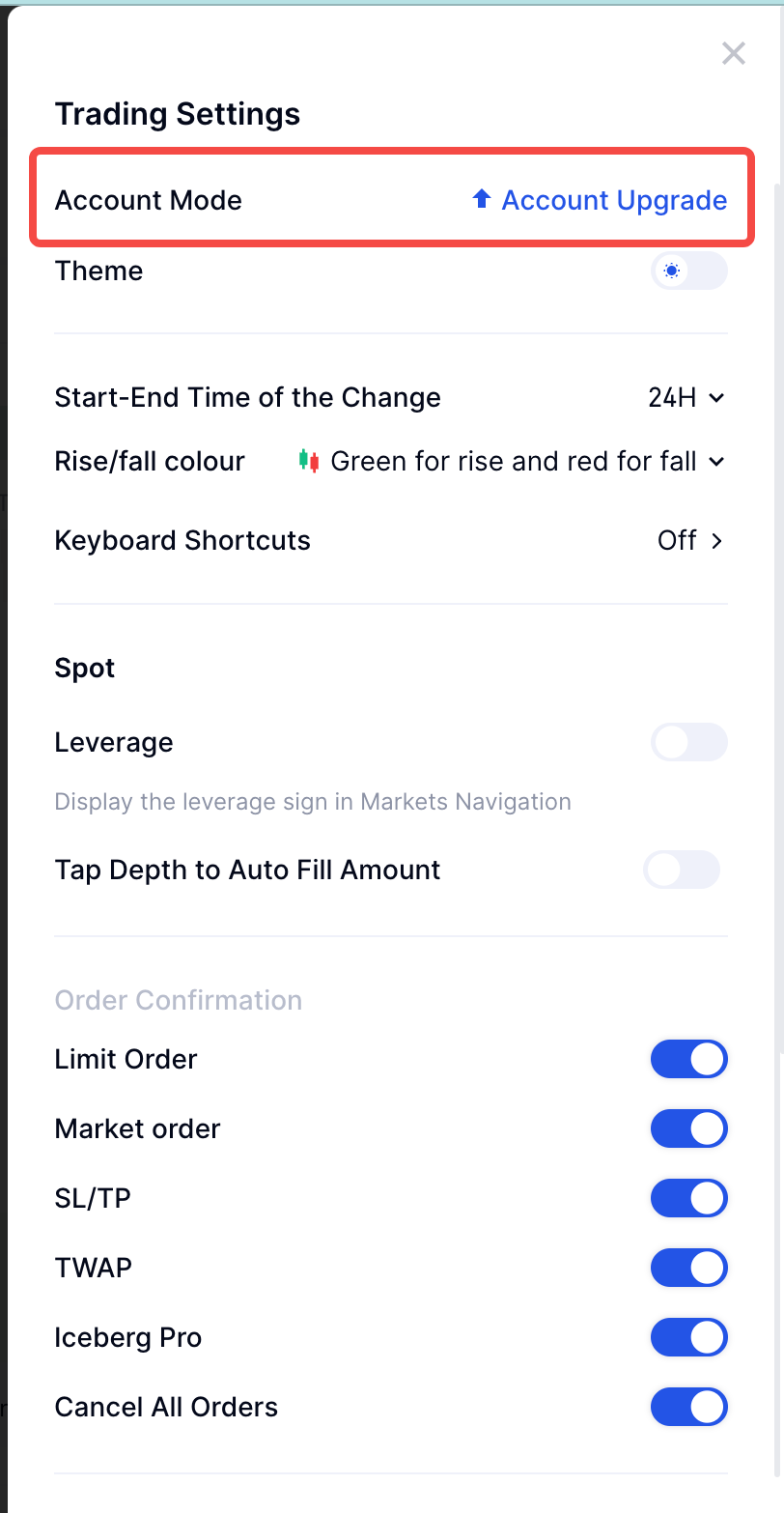 As contas unificadas suportam três modos: Classic Spot, Multi-Moeded Margin e Portfolio Margin. Se você já atualizou para uma conta unificada e deseja mudar de modo, as etapas são as seguintes: