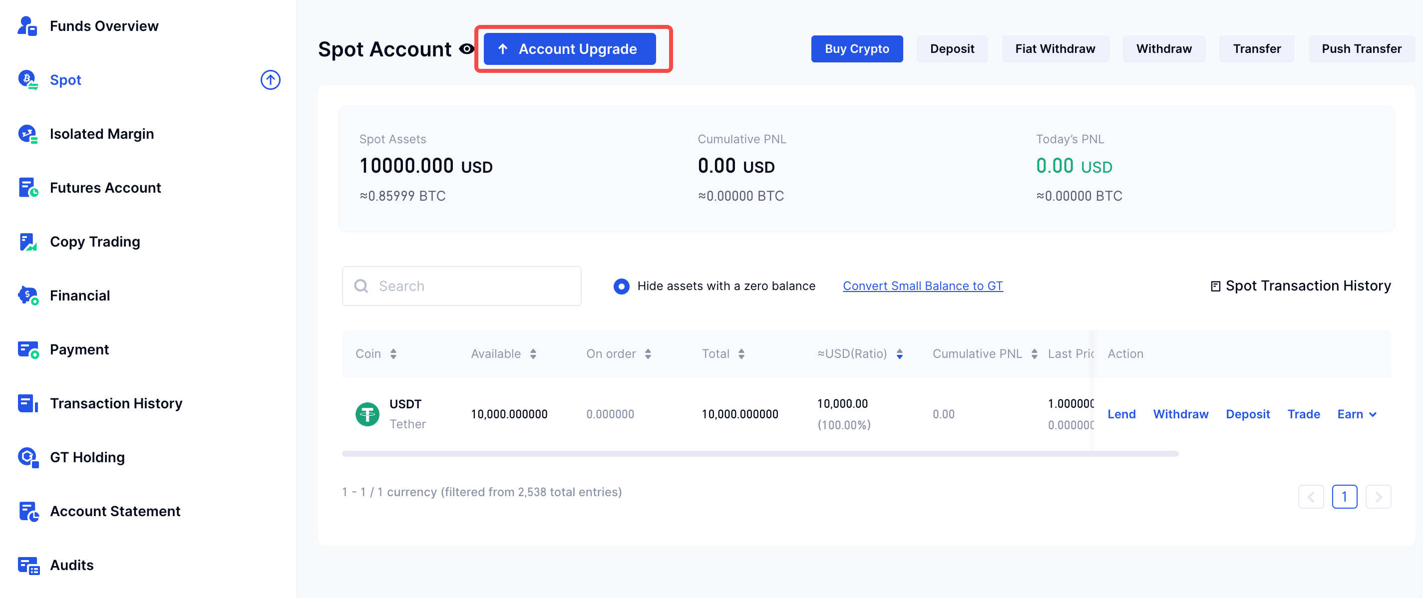 Opção C) Configurações do modo de conta: Clique em “Atualização de conta”, que é visível nas seções Mercado à vista ou Futuros perepuais do USDT.