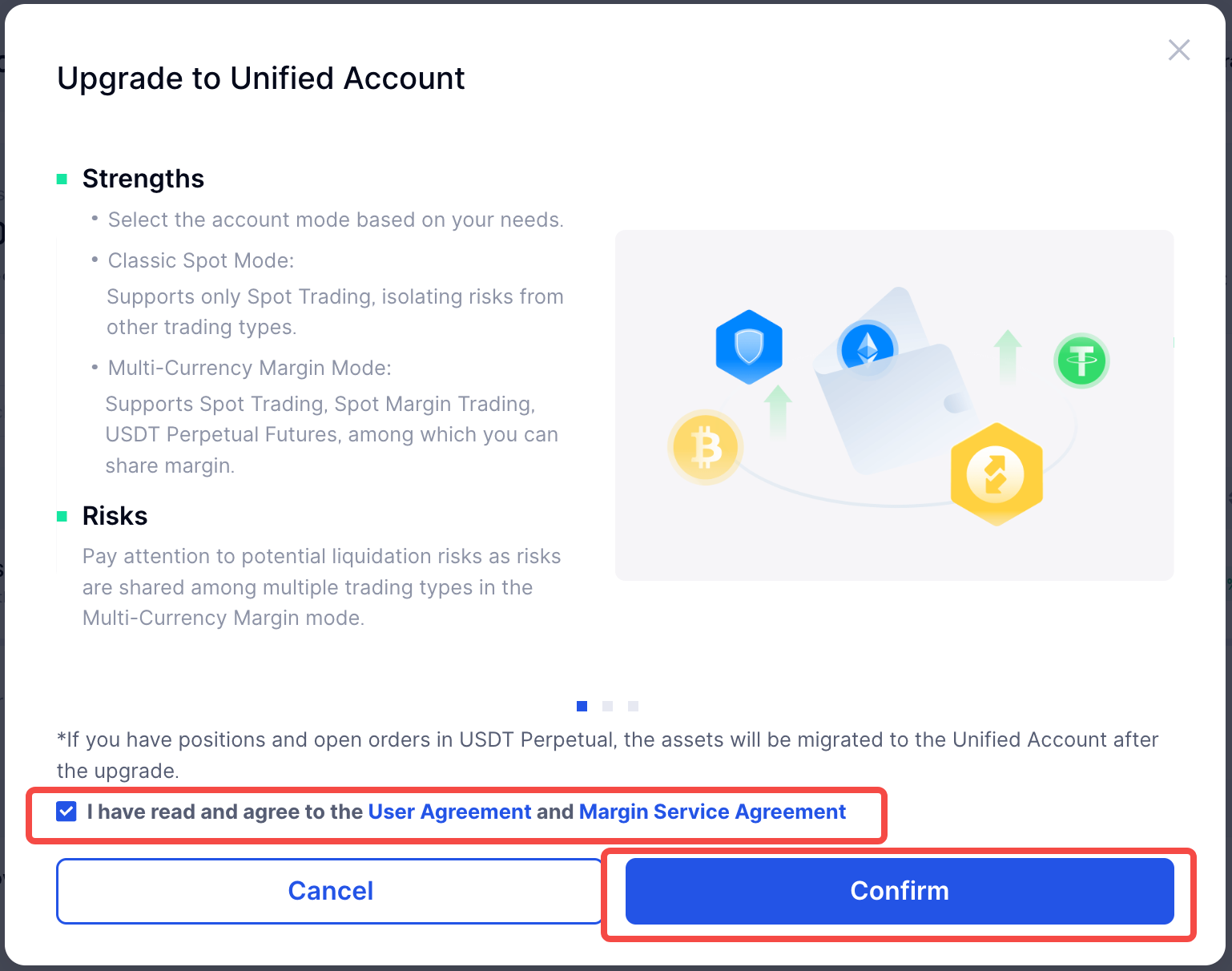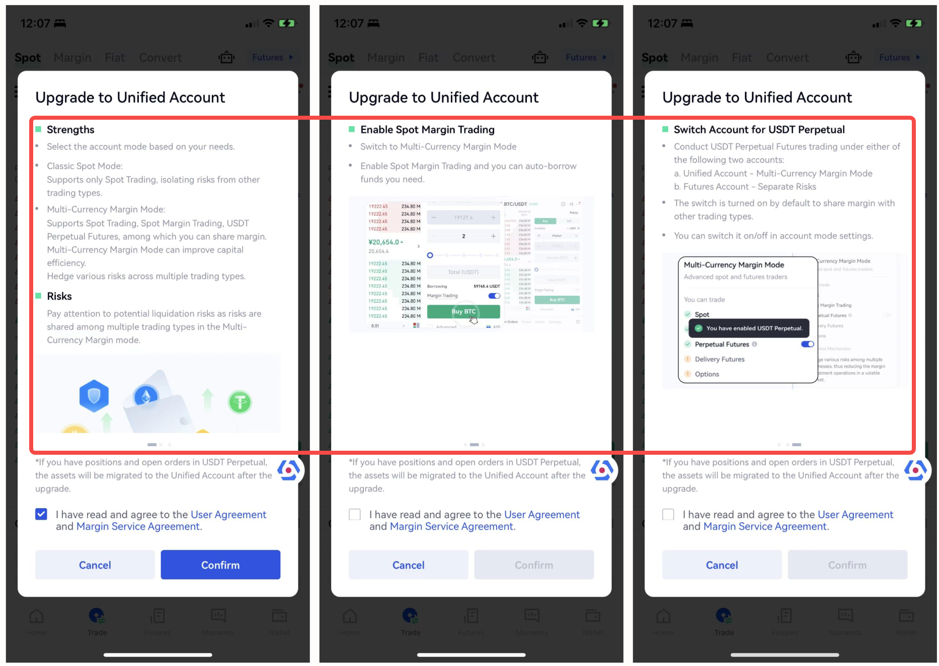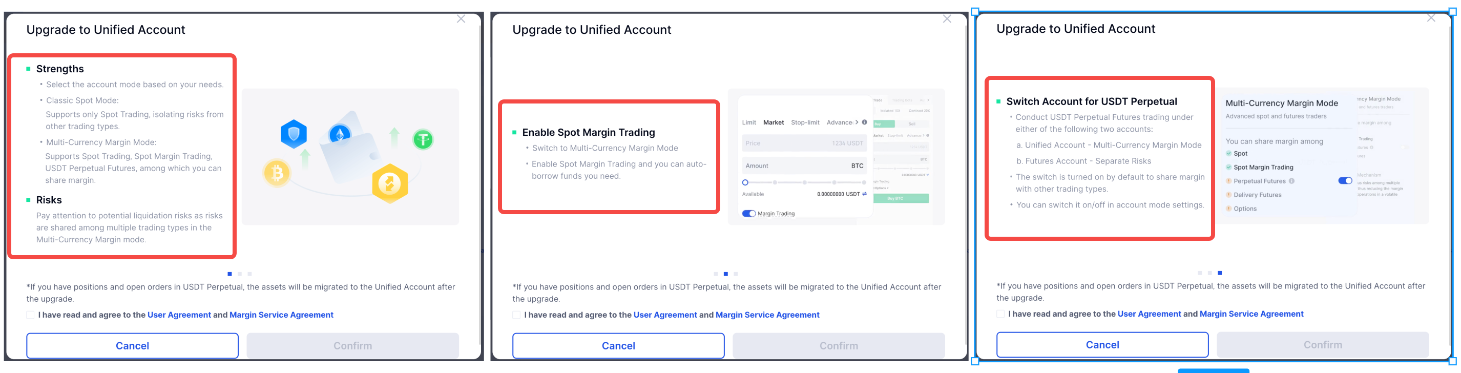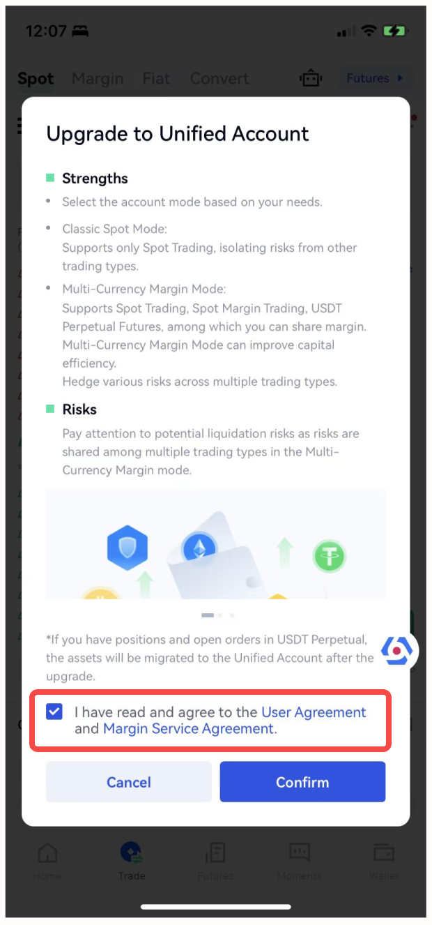 Depois de concluir a atualização da Conta Unificada, você poderá negociar à vista, alavancagem e contratos em uma conta. Isto evita transferências de fundos tediosas e melhora significativamente a utilização dos fundos devido à partilha de margens.