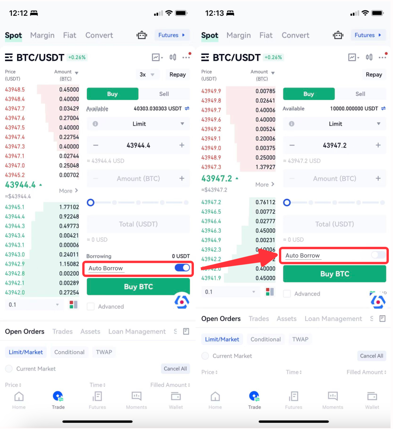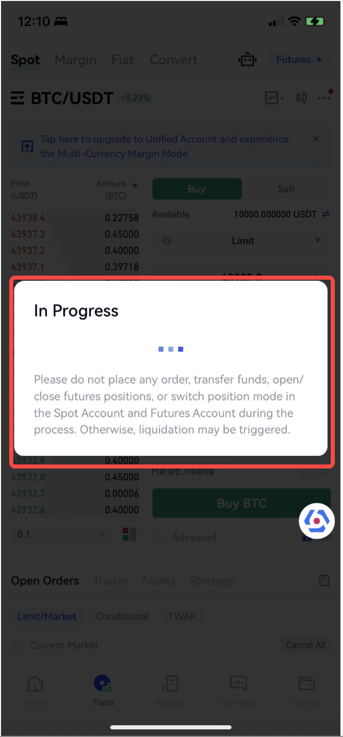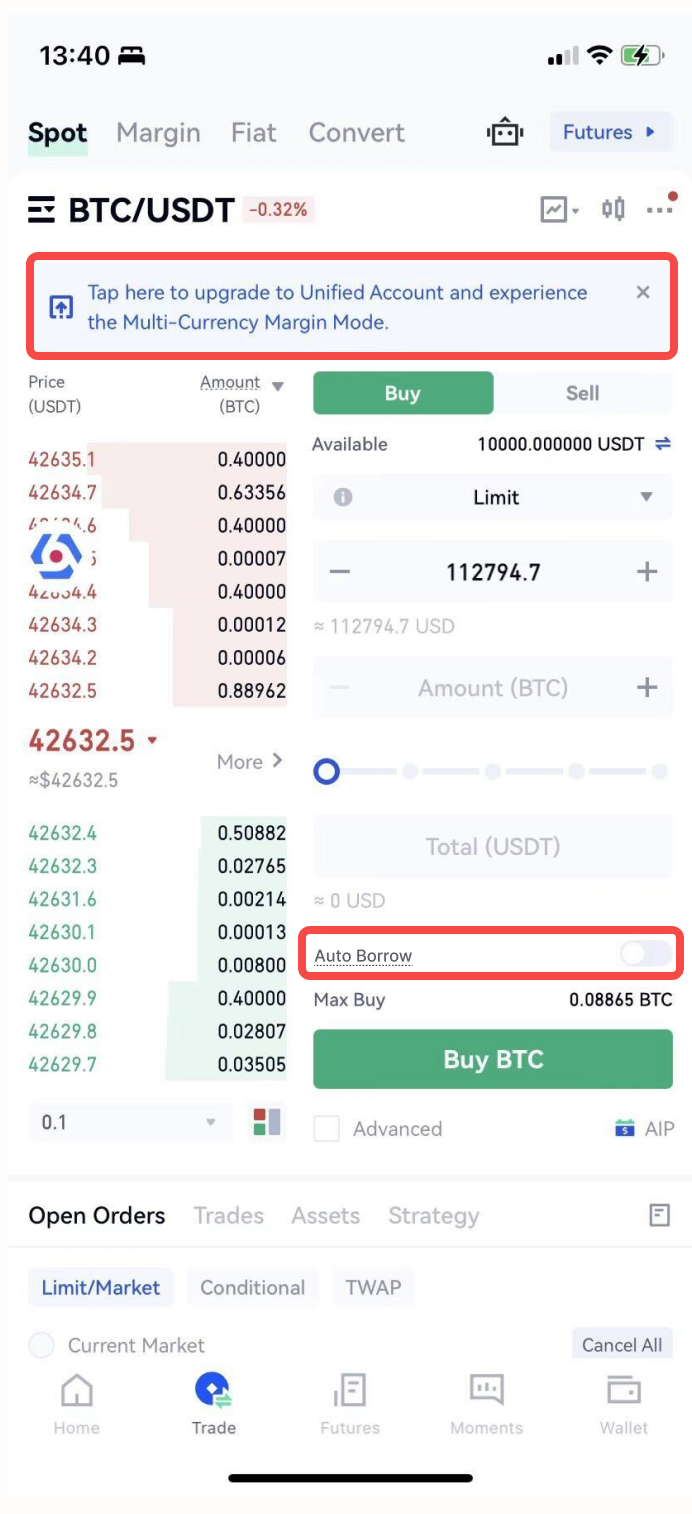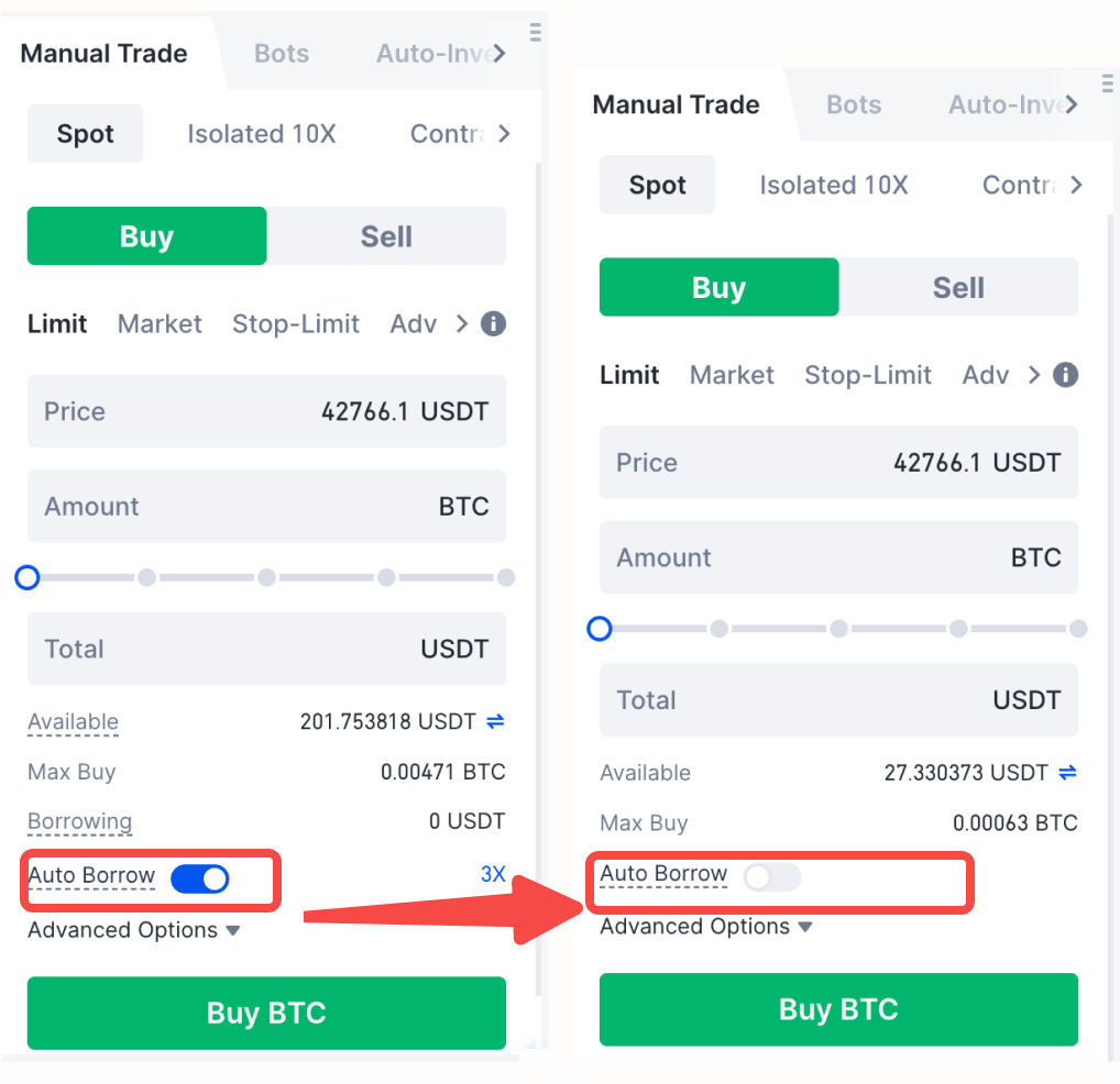 O empréstimo automático é uma negociação alavancada com base no mercado à vista, que só é suportado em uma conta unificada. Depois que a atualização for bem-sucedida, a opção “Empréstimo Automático” será habilitada por padrão. Se o saldo disponível na conta for insuficiente no momento da realização de um pedido, ele será automaticamente emprestado na plataforma. Você pode optar por desligar este botão a qualquer momento. Uma vez desligado, ele retornará ao modo spot normal.