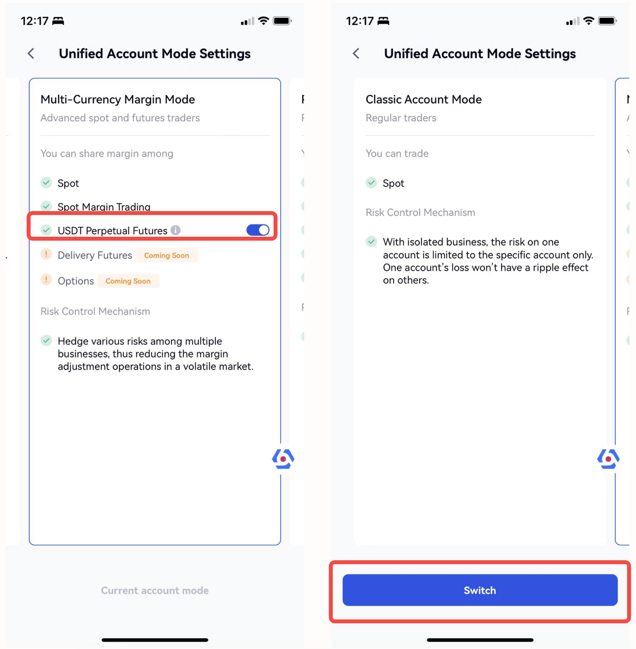 Etapa 2: Selecione o modo para o qual deseja mudar e clique no botão “Alternar”; no modo Margem Multimoeda, você também pode escolher se deseja ativar os contratos perpétuos do USDT. Uma vez ativado, você pode compartilhar a margem com outros tipos de ativos/mercados.