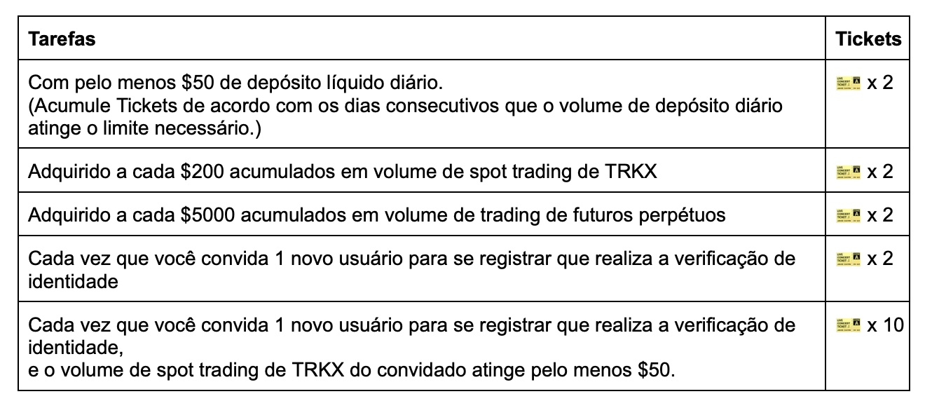 4.As recompensas serão em TRKX, com um prêmio total de 640.000 TRKX. Os participantes devem completar qualquer trading spot de TRKX durante o evento para serem elegíveis a dividir o prêmio dos Tickets. As recompensas serão distribuídas em tokens do projeto dentro de 14 dias úteis após o término da campanha (“Carteira” – “Fatura”). O anúncio da distribuição das recompensas será divulgado no Gate News.