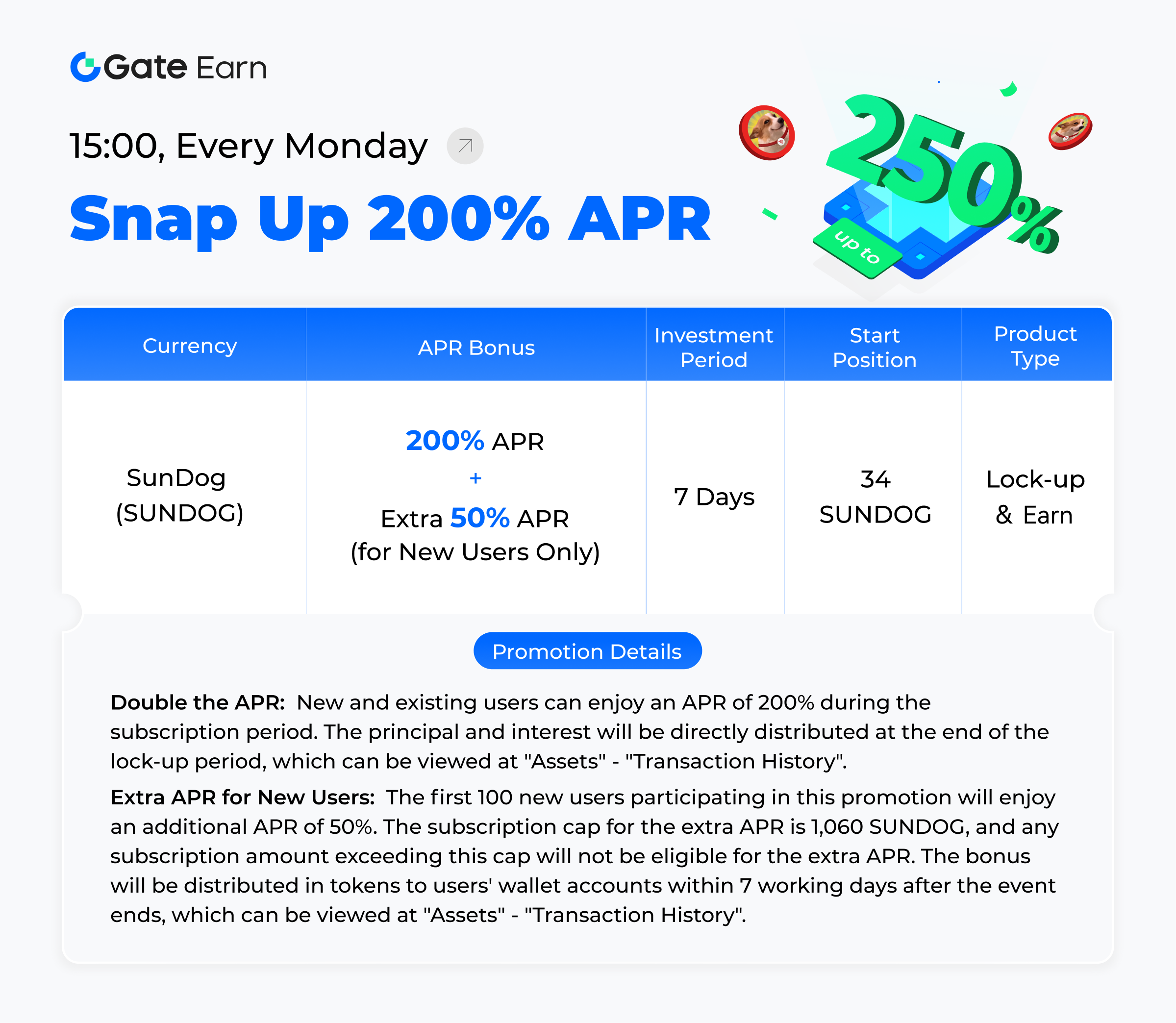 A Gate Hodl & Earn lista um produto altamente lucrativo e de baixa exigência com alta segurança todas as segundas-feiras, permitindo que todos os utilizadores desfrutem de ganhos duplicados e de uma elevada APR! Além disso, se é um utilizador recém-registado e utilizar este produto, pode obter uma APR extra.