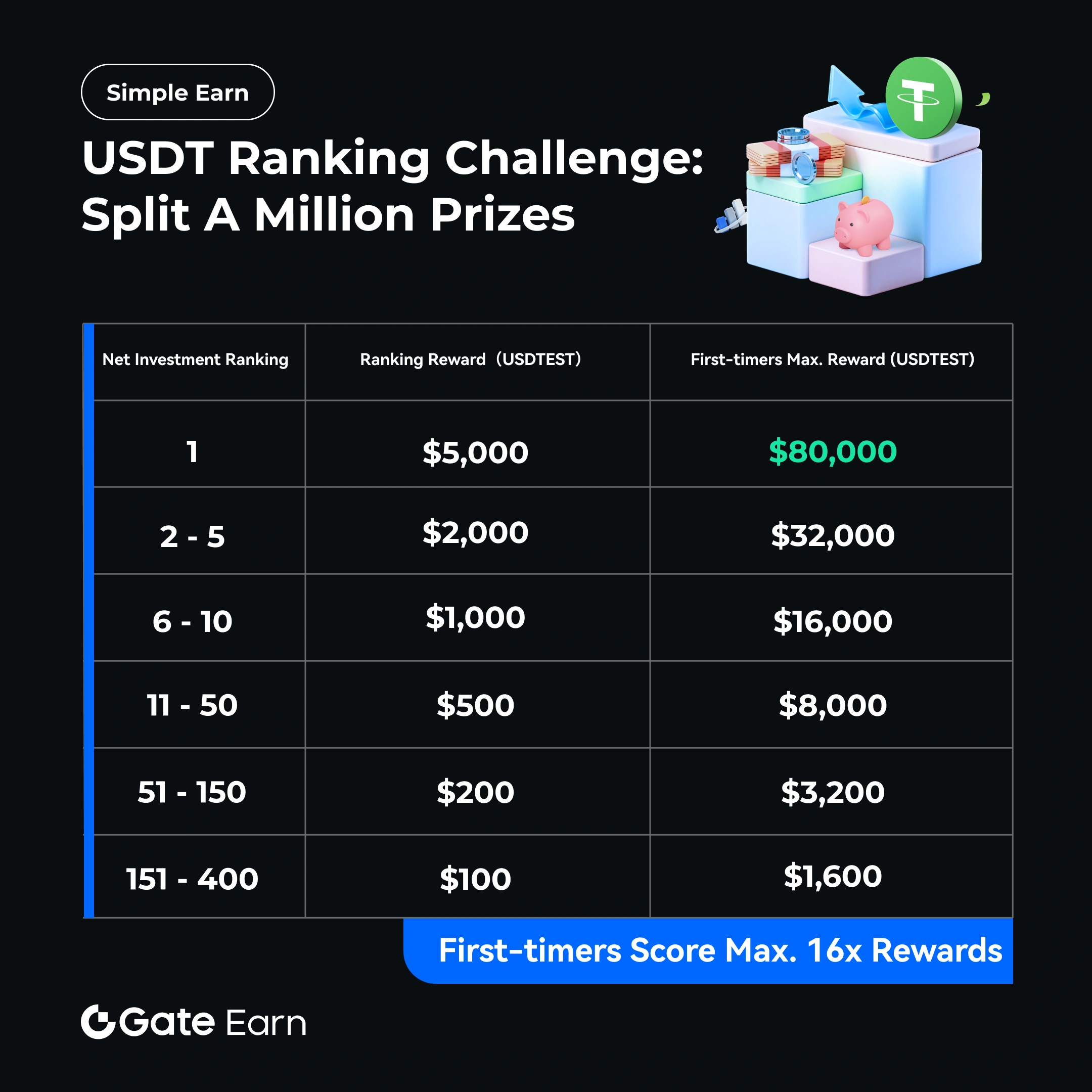 O Desafio de Investimento USDT Simple Earn da Gate está agora ativo. Inscreva-se agora para subscrever os produtos flexíveis e fixos USDT do Simple Earn, e os 400 melhores utilizadores com base em investimentos líquidos partilharão um prémio de um milhão de dólares. Os utilizadores do Simple Earn pela primeira vez podem desfrutar de um multiplicador de bónus até 16 vezes, com a chance de ganhar até $80,000 USDTEST.