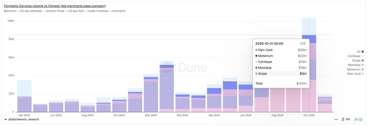 O dinamismo recente de pagamentos na Polygon comprova esta tendência. Em outubro de 2025, o volume de transferências “on-chain” da Polygon atingiu um máximo histórico, com:
