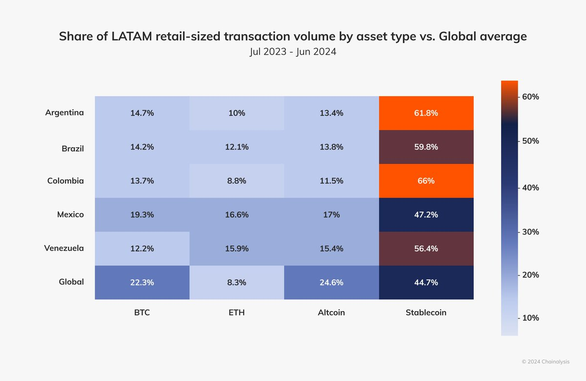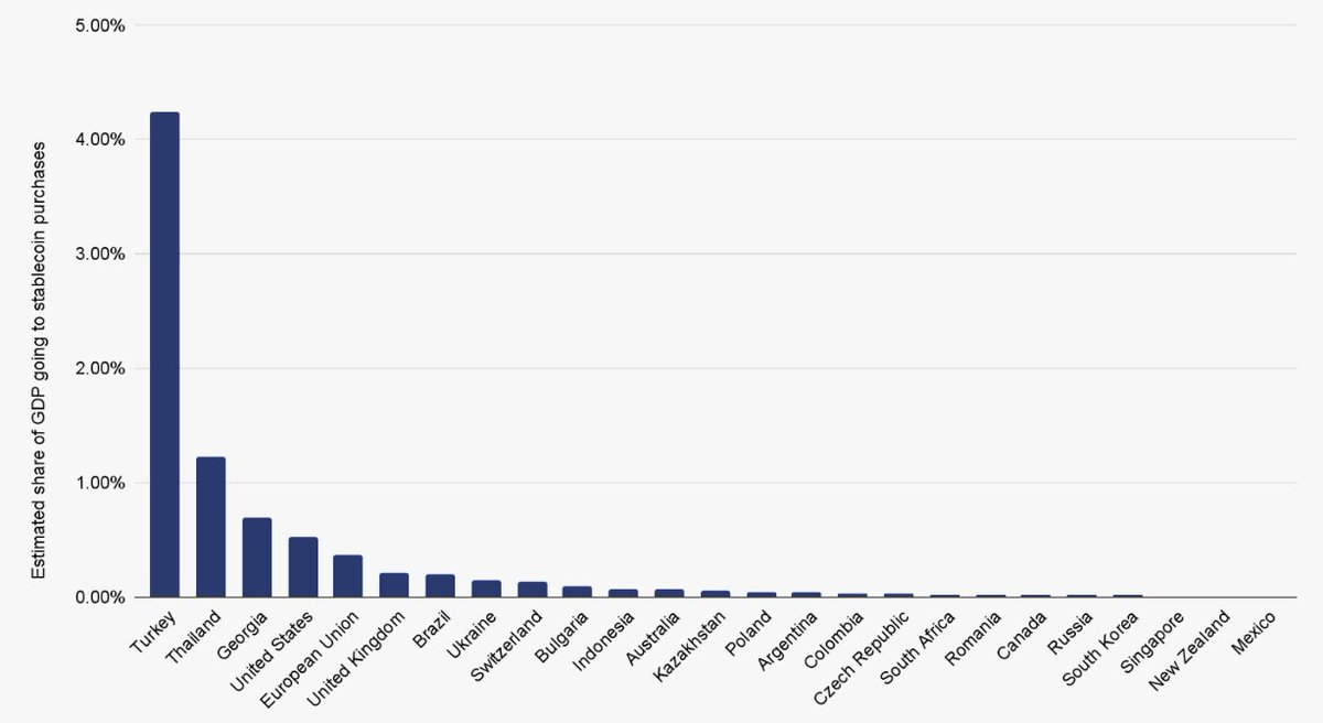 Na Turquia, onde a inflação também ultrapassou os 60 %, a adoção atingiu um nível sem precedentes. Entre abril de 2023 e março de 2024, as compras de stablecoins turcas representaram 4,3 % do PIB, a maior proporção mundial, com cerca de 38 mil milhões comprados nesse período. As stablecoins representam já mais de metade do volume das transações cripto em muitos mercados emergentes, superando ativos como o Bitcoin.
