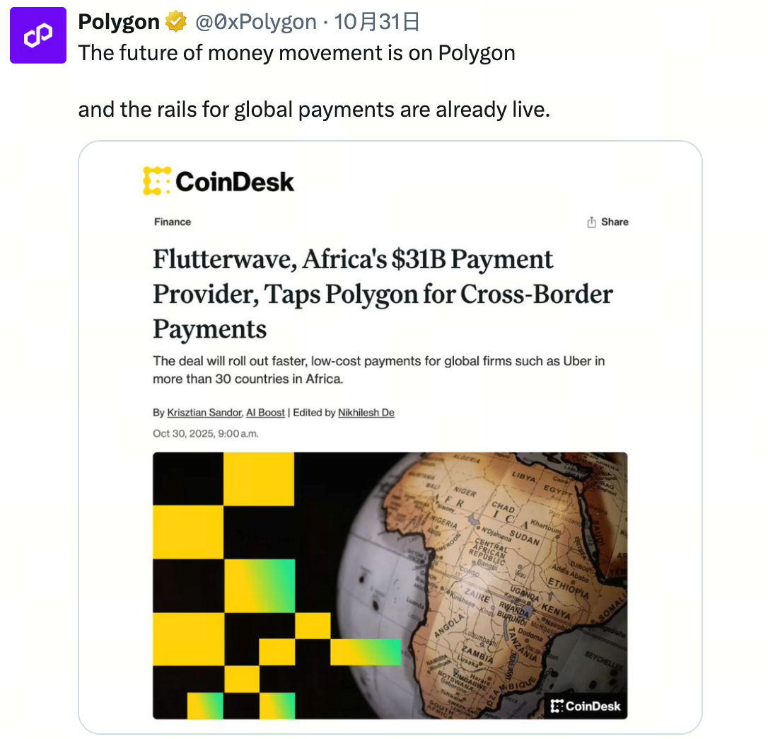 Este ano, a Flutterwave, maior processador africano de pagamentos (mais de 40 mil milhões por ano), adotou a Polygon como blockchain padrão para liquidações de stablecoins transfronteiriças em mais de 30 países. Trata-se de uma das maiores implementações reais de stablecoins na história, alimentando fluxos de consumidores e empresas para clientes como Uber e Audiomack.