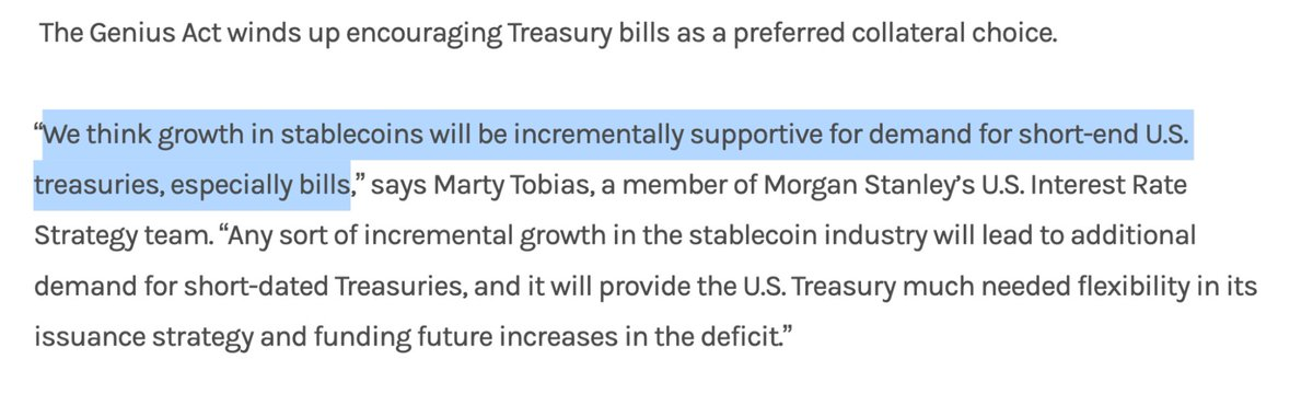O GENIUS Act obriga as stablecoins em dólares a serem integralmente garantidas por ativos líquidos e seguros — numerário e Títulos do Tesouro de curto prazo. Cada nova stablecoin emitida significa um novo comprador para a dívida americana, uma versão moderna da reciclagem de excedentes do petrodólar em Títulos do Tesouro nos anos 70. Há analistas que descrevem as stablecoins como um “cavalo de Troia” para a dívida americana, garantindo procura crescente por títulos do Tesouro americano de uma base de utilizadores global.