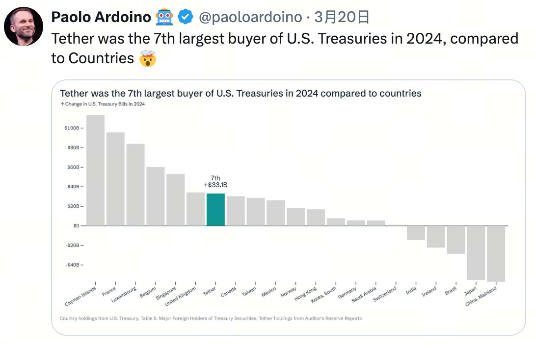 No final de 2024, @Tether_to já era o sétimo maior investidor estrangeiro em Títulos do Tesouro dos EUA, ultrapassando países como o Canadá e o México em volume anual de compras.