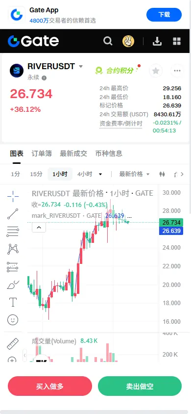 $RIVER Após um aumento de volume de 34.98%, ocorreu uma forte ruptura, com o volume de posições simultaneamente disparando, indicando uma entrada de força principal, e não uma pressão de venda.