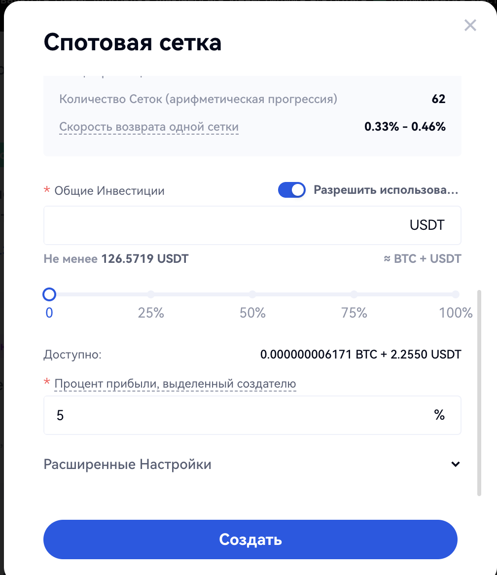 Если вы новичок, рекомендуется выбрать "умную сетку". Умная сетка с искусственным интеллектом тестируется на основе исторических данных за последние 7 дней и определяет параметры сетки с наибольшей доходностью: верхняя предельная цена, нижняя предельная цена и количество сеток. Трейдерам необходимо только определить общую сумму инвестиций. (Общая сумма инвестиций должна быть больше или равна минимальной сумме инвестиций.)
