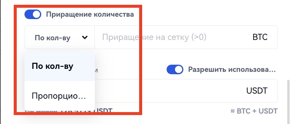 По умолчанию функция "Увеличение количества" отключена. Включив ее, вы можете увеличить сумму покупки/продажи в каждой сетке "За количество" или "Пропорционально".