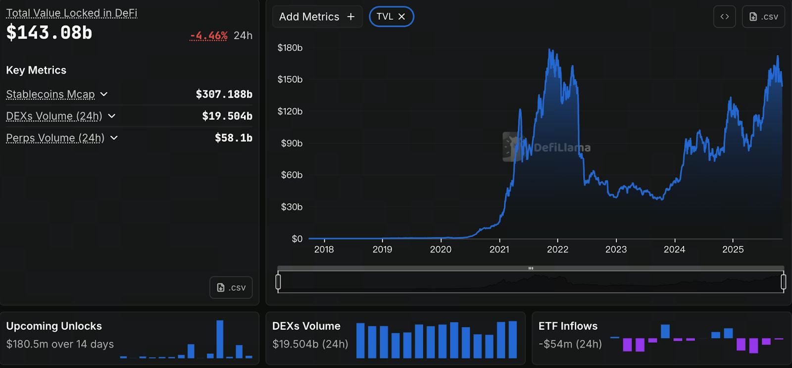 Согласно агрегированным данным в реальном времени, на момент публикации панель DeFiLlama фиксирует общий объем заблокированных средств на уровне примерно $142,10 млрд. Такой показатель рассчитан по методике снимка состояния. Для сравнения, квартальные отчеты и независимые исследования оценивают TVL в диапазоне $156–$170 млрд за III квартал 2025 г. или конец сентября, акцентируя внимание на квартальном росте и макроэкономических тенденциях. Различия в методиках касаются включения мостовых активов и способов оценки стейблкоинов.
