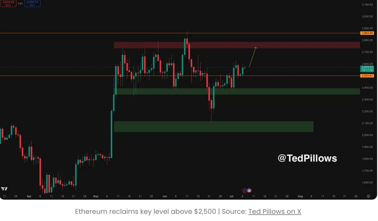 Ethereum сильно укрепляется, нацеливаясь на верхнюю границу диапазона Ethereum продолжает торговаться в четком диапазоне консолидации, колеблясь между 2,400 и 2,700 долларов с начала мая. После восстановления уровня 2,500 долларов и его трансформации в уровень поддержки, Ethereum в настоящее время, похоже, набирает силу и может вскоре прорываться. Тед Пиллоуз подчеркнул этот переход импульса и заявил, что Ethereum “выглядит неплохо”, и, возможно, вскоре вернется к верхней границе диапазона.