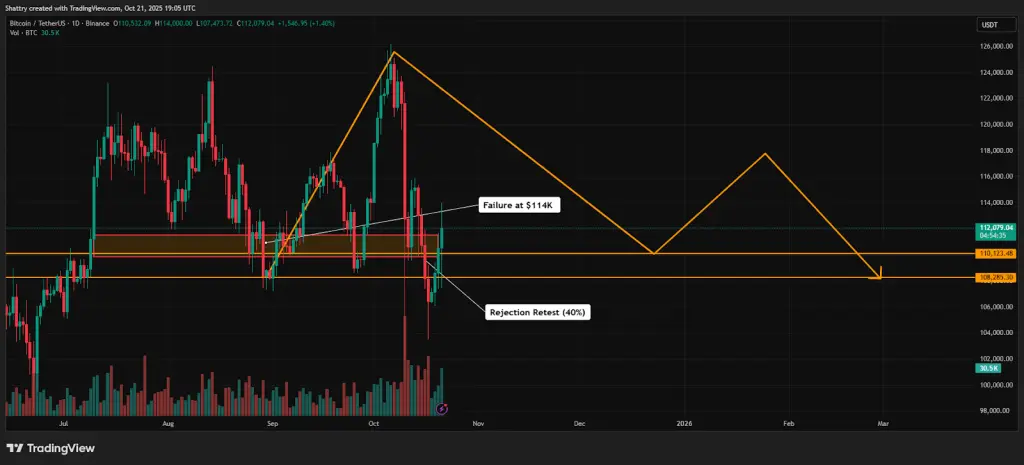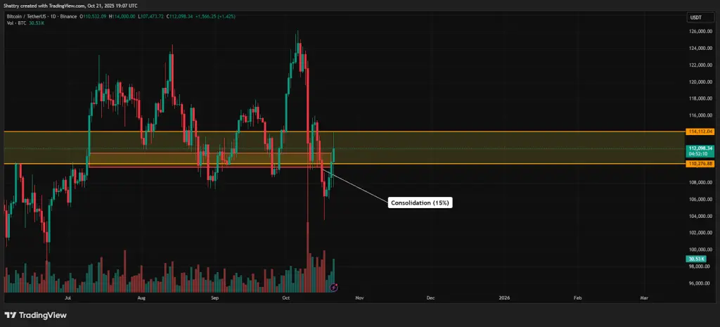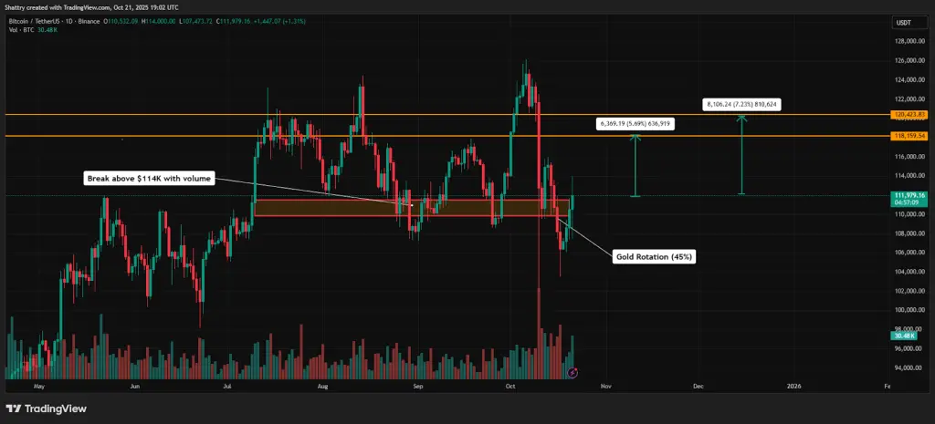 Диапазон от 110,000 долларов до 114,000 долларов позволяет золотым ротациям и накоплению институтов. Эта боковая консолидация может продолжаться несколько недель в ожидании более четких катализаторов или изменений в макроокружении.