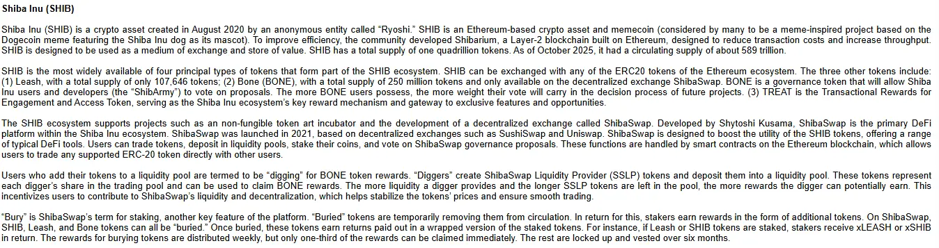 Тем временем, подача предоставила информацию о токене SHIB и более широкой экосистеме Shiba Inu, описывая SHIB как наиболее доступный токен в сети. Также были выделены другие активы экосистемы, включая BONE, LEASH и TREAT, а также ключевые проекты, такие как Shibarium и ShibaSwap.