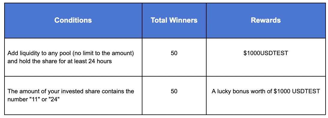 To join this activity, users need to add liquidity to a pool of choice (no limit to the amount), hold the share for at least 24 hours, and fill in the form. After the activity ends, 50 lucky users will be randomly selected from all eligible participants to receive $1000 USDTEST. Moreover, if the amount of your invested share contains the number "11" or "24", you will have a chance to win a lucky bonus. Bonuses are served on a first-come, first-served basis. Come and join the activity now!