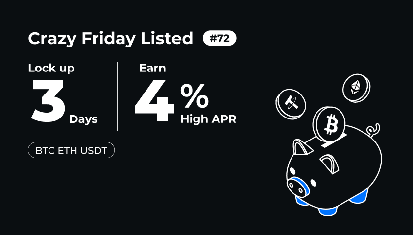 This phase of Crazy Friday allows for locking BTC/ETH/USDT for as short as 3 days. The APR reaches 4% and the total subscription quota is limited and will be served on a first-come-first-served basis!