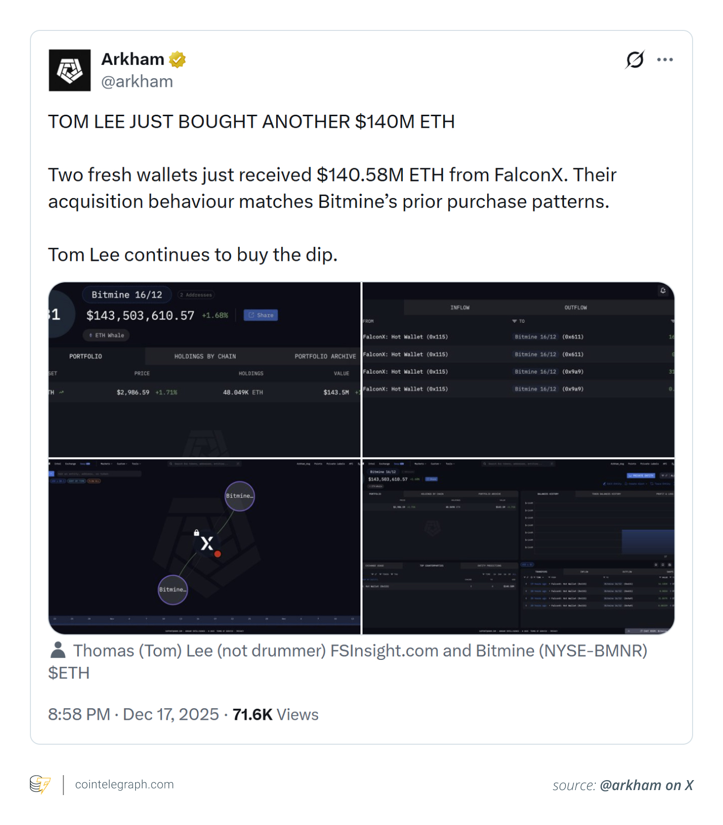 On Dec. 17, the company added another $140 million in ETH to its Ether stack, according to Arkham.