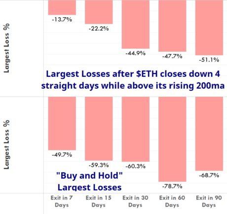 But while the average trade statistic remains important, it does not always tell the whole story. When looking at a comparison of the largest hypothetical losses for both approaches using the same conditions described earlier, note that the largest losses (i.e., worst trades) for the current four days down setup are far lower than for a simple “buy and hold” approach. This largest loss comparison indicates that while the current setup may not beat “buy and hold” in terms of average trade, Ethereum may currently have a lower than usual risk exposure – something most experienced traders will appreciate.