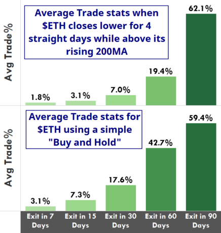 What does this pullback in Ethereum suggest for its price? To find out, we’ll look at all signals since inception, and also compare those signals to a simple “buy and hold” approach. This will provide us with a baseline to better understand today’s test results.