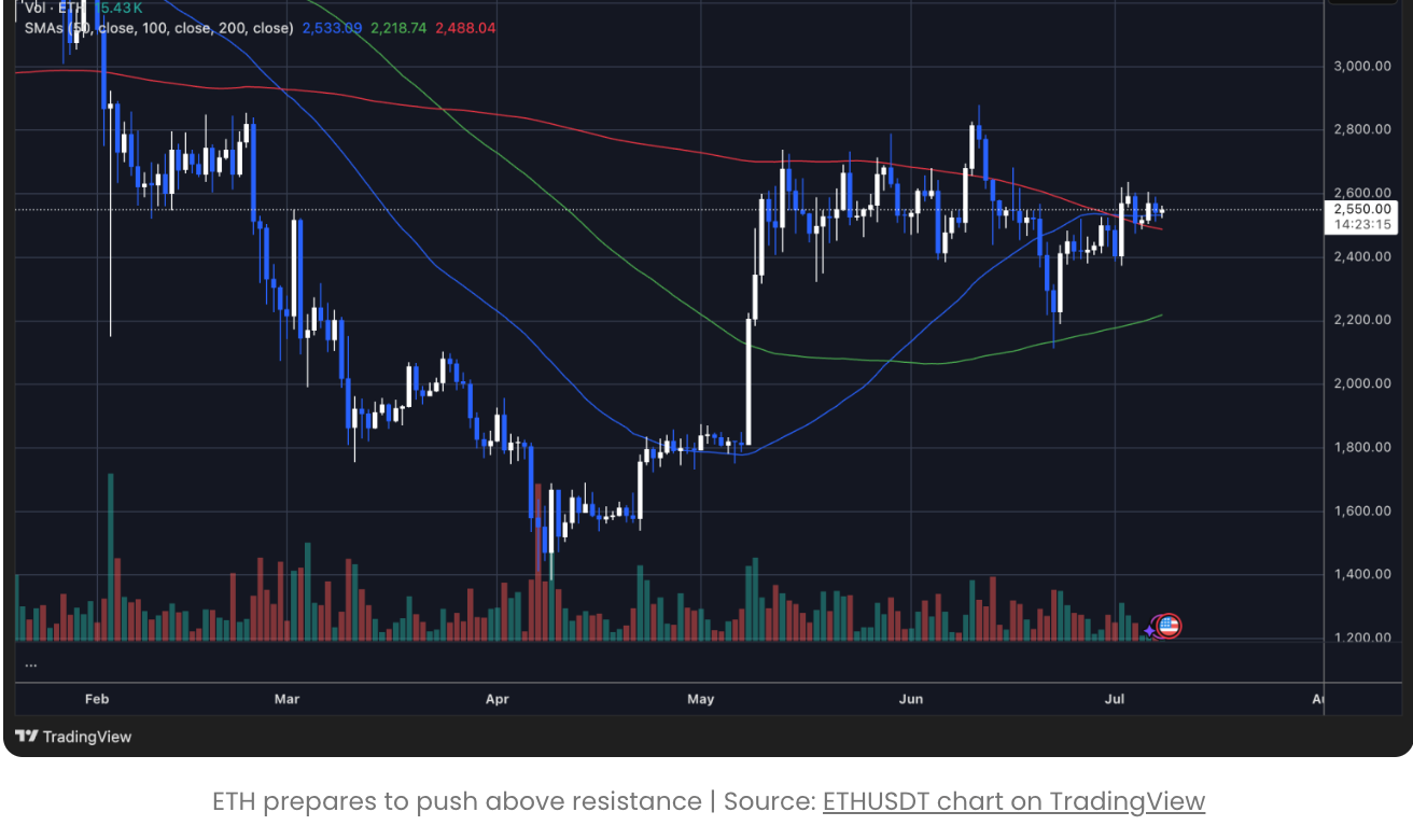 Зі стисканням консолідації, ETH тестує рівень спротиву Ціна на Ethereum становить 2 550 доларів, утримуючись над ключовою ковзною середньою і продовжуючи консолідуватися в вузькому діапазоні. На денному графіку видно, що ETH намагається пробити 200-денну ковзну середню (червона), яка наразі знаходиться поблизу 2 488 доларів, одночасно успішно утримуючись над 50-денною ковзною середньою (синя) та 100-денною ковзною середньою (зелена). Збіг ключових технічних рівнів підкреслює баланс між поточними лонг позиціями та короткими.