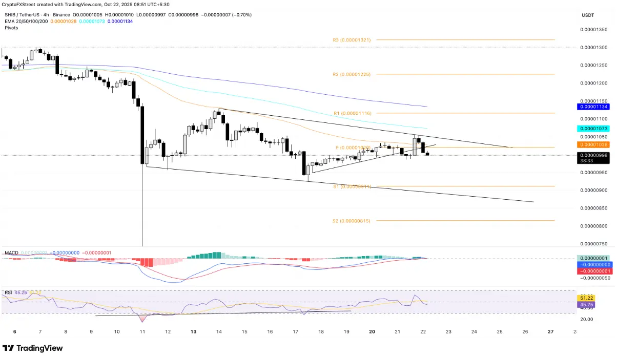 Станом на момент написання статті ( середа ), SHIB торгується нижче психологічного рівня 0,00001000 USD, що вказує на ризик входження в новий спадний цикл у моделі цінового каналу на 4-годинному графіку. Найближча зона підтримки знаходиться на S1 Pivot Point – 0,00000911 USD, що збігається з областю базової лінії спадного каналу.
