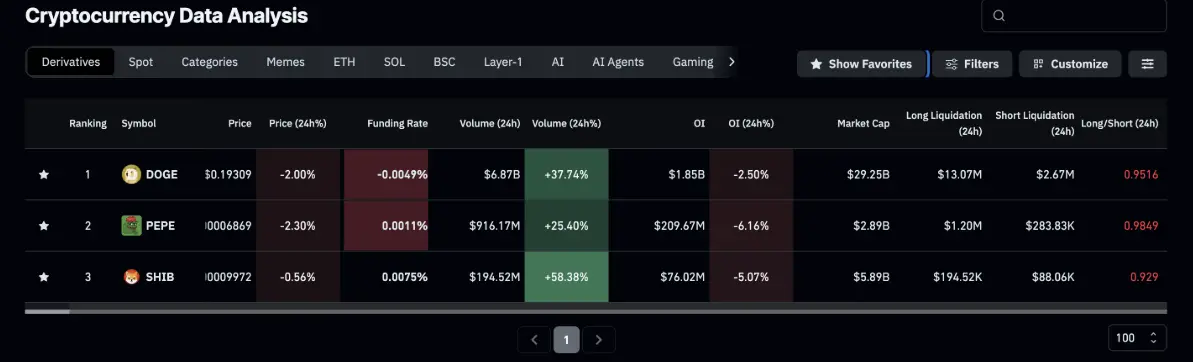 Дані про отримання мемної монети | Джерело: CoinGlassСкорочення OI вказує на те, що інвестори зменшують ризик, можливо, зменшуючи важелі або закриваючи частину позицій, що відображає обережний настрій, що поширюється на крипторинок мемних монет.