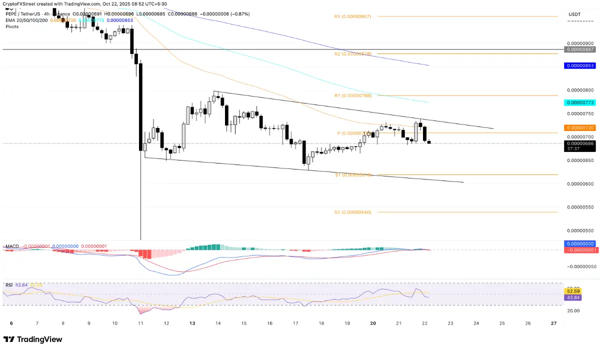 Після трьох поспіль відскоків PEPE повернувся до падіння на 3% у вівторок, що стало початком нового коригування. Станом на середу вдень, цей токен торгується нижче позначки 0,00000700 USD, з найближчою зоною підтримки на S1 Pivot Point – 0,00000619 USD.