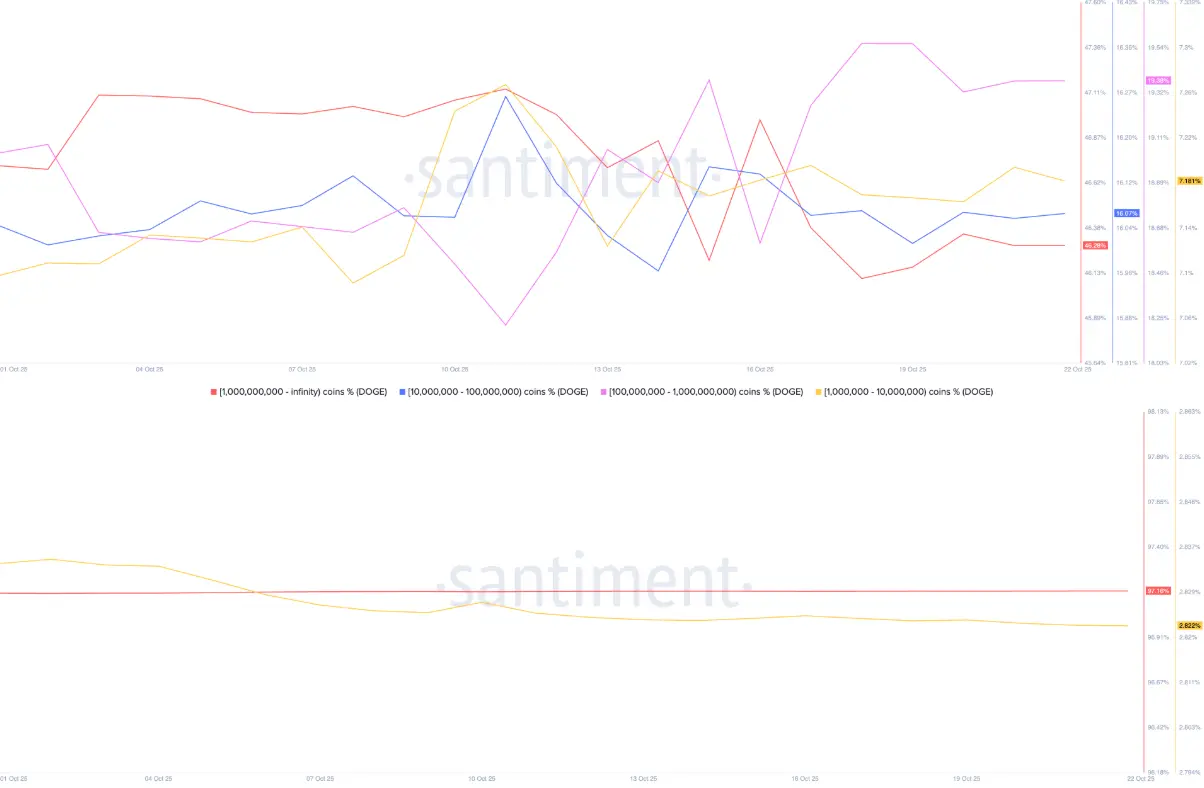 Дані з Santiment показують, що гаманці Dogecoin, які утримують понад 1 мільярд токенів, знизили частку володіння з 46,75% до 46,28% від загального обсягу постачання з 1 жовтня. Що стосується Shiba Inu, група, яка утримує від 1 мільйона до 1 мільярда SHIB, також знизила частку володіння з 2,83% до 2,822%, тоді як група “китів” з понад 1 мільярдом SHIB продовжує контролювати 97,16%.