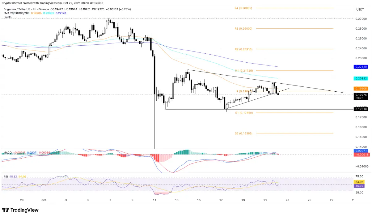 DOGE не зміг утриматися на психологічному рівні підтримки 0,2000 USD, одночасно створивши нижчі вершини на 4-годинному графіку — тим самим сформувавши низхідний тренд, що з'єднує вершини, встановлені в четвер. Станом на момент написання статті ( середа ), DOGE впав майже на 1%, продовживши падіння на 2,87% попередньої сесії.
