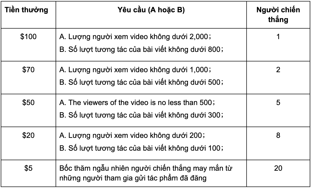 3.Video/bài đăng đã gửi sẽ được đánh giá dựa trên mức độ liên quan của nội dung và dữ liệu thực tế như lượng tương tác và lượt xem video. Mọi dữ liệu sai lệch sẽ bị coi là gian lận.