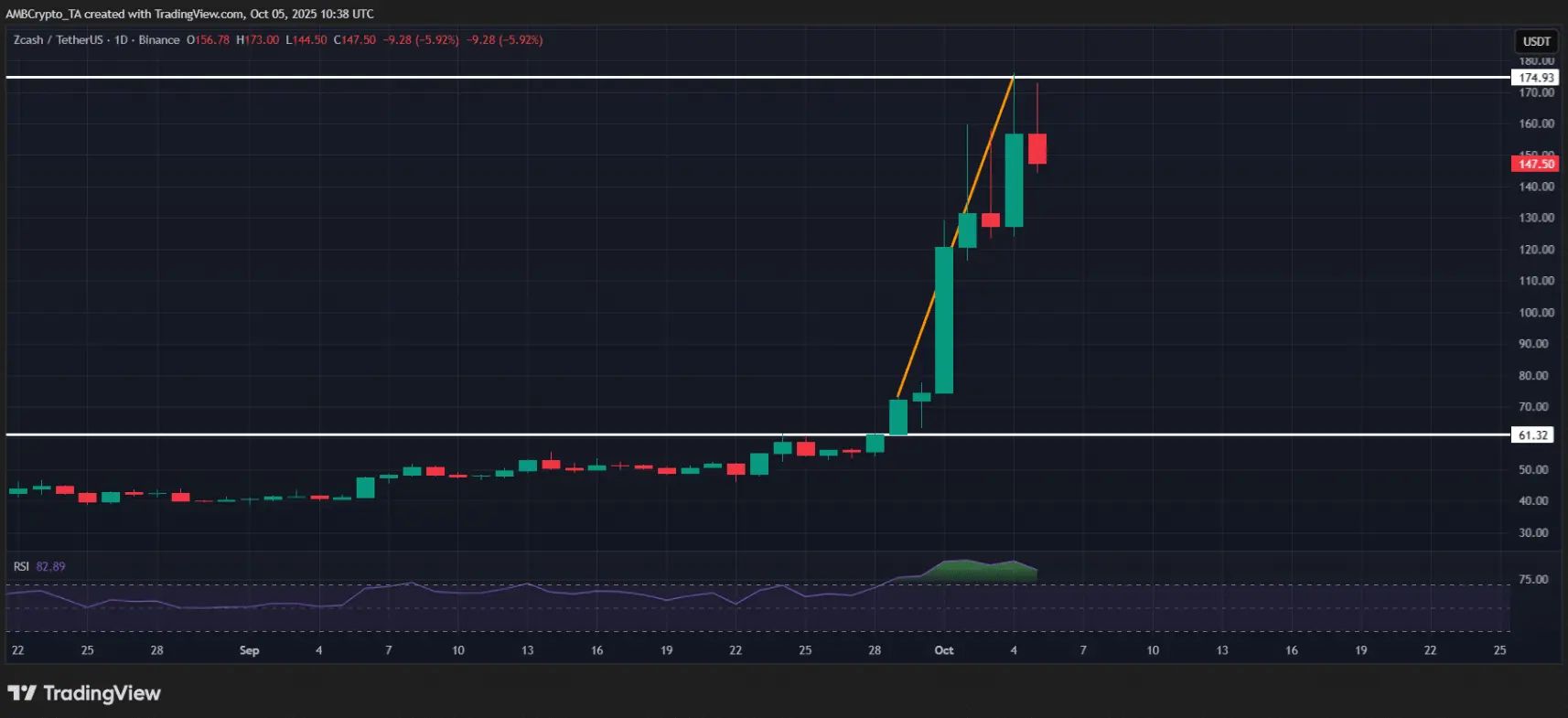 Biểu đồ ZEC/USDT hàng ngày | Nguồn: TradingViewTrên biểu đồ kỹ thuật, RSI duy trì ở vùng cao, phản ánh lực mua mạnh do tâm lý sợ bỏ lỡ, song tín hiệu niềm tin đang dần suy yếu. Việc ZEC giảm 5,96% trong ngày, chốt ở 147 USD, cho thấy dòng tiền yếu đang bị thanh lọc.
