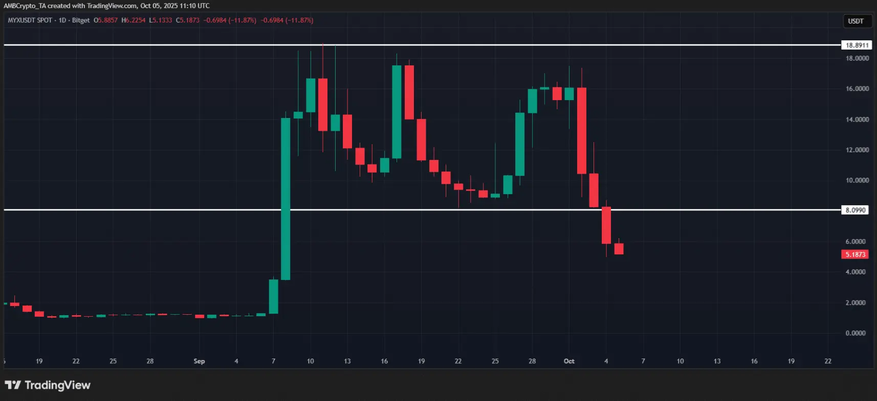 Diễn biến này đã xóa sạch toàn bộ đà tăng của tháng 9, thời điểm MYX từng ghi nhận ba nhịp phục hồi liên tiếp nhưng đều thất bại trước ngưỡng kháng cự 20 USD. Trong bối cảnh đó, mức giảm mạnh hơn 60% có thể được xem như một pha điều chỉnh lành mạnh, giúp thị trường tái cân bằng và “rũ bỏ” đòn bẩy dư thừa.