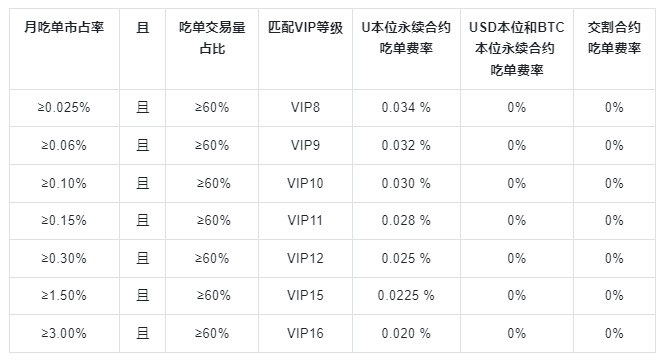 1. 吃單(Taker)使用者可搭配更高VIP等級及更低吃單費率