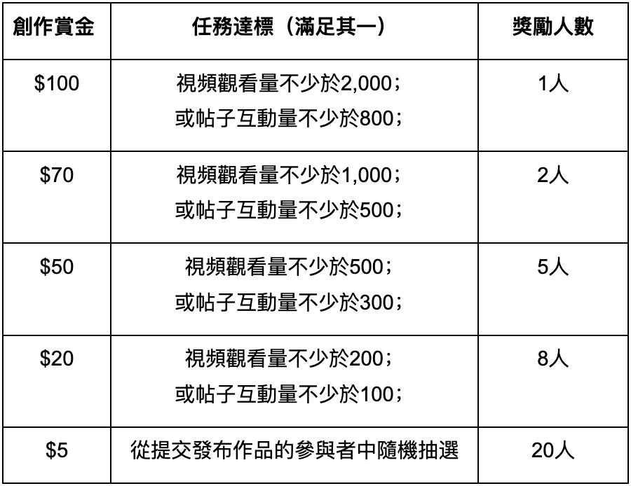 3.提交的視頻/帖子將從內容相關性和互動量、視頻觀看量等真實數據進行評估,任何虚假数据将视为作弊。