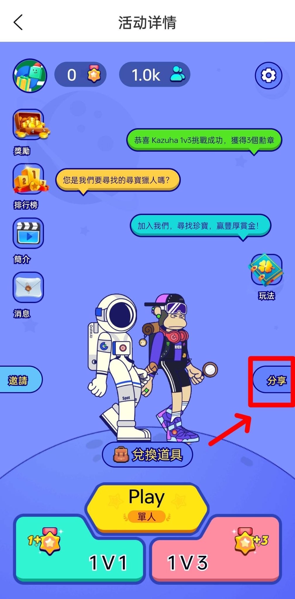 3. 當有用戶點擊上述分享的頁面鏈接,並成功登錄至尋寶大作戰頁面;每位被邀請的用戶最多為一個鏈接點擊助力,並且參與至少1場遊戲,即算有效邀請。 *總獎池:$1,000,按照邀請人數排名先後瓜分獎池。