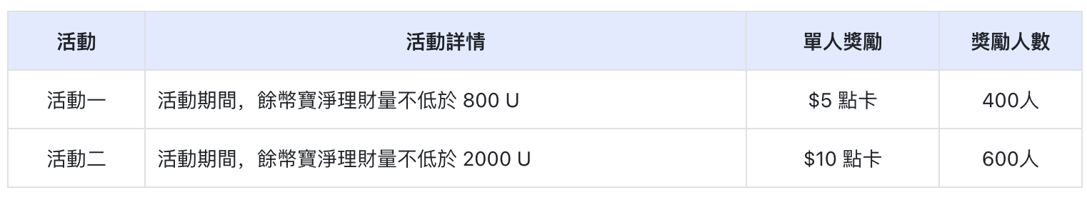 活動期間參與餘幣寶理財有机会瓜分$8,000點卡獎勵,多重獎勵可疊加領取,歡迎參與!