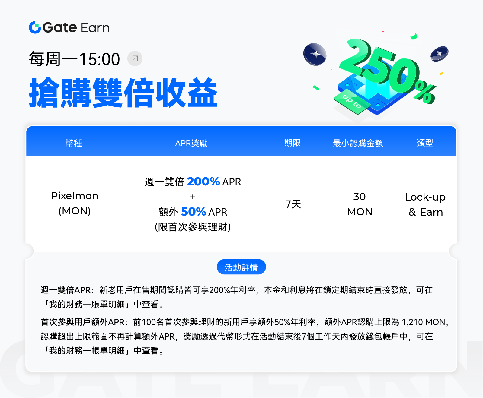 Gate Hodl & Earn 每週一推出一款低門檻、高安全性和高收益率的產品。您可以享受雙倍的穩定利潤和高年利率!首次參與理財的用戶參與也將享有額外的專屬APR。